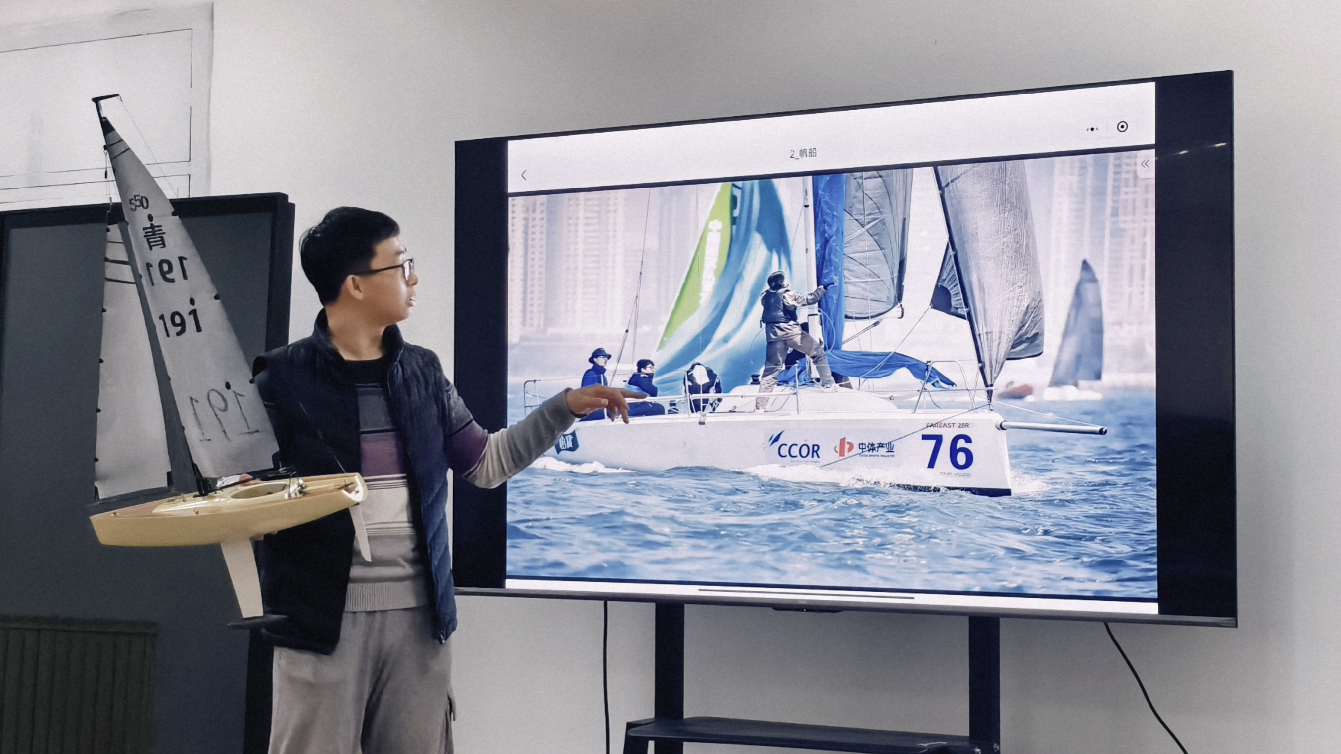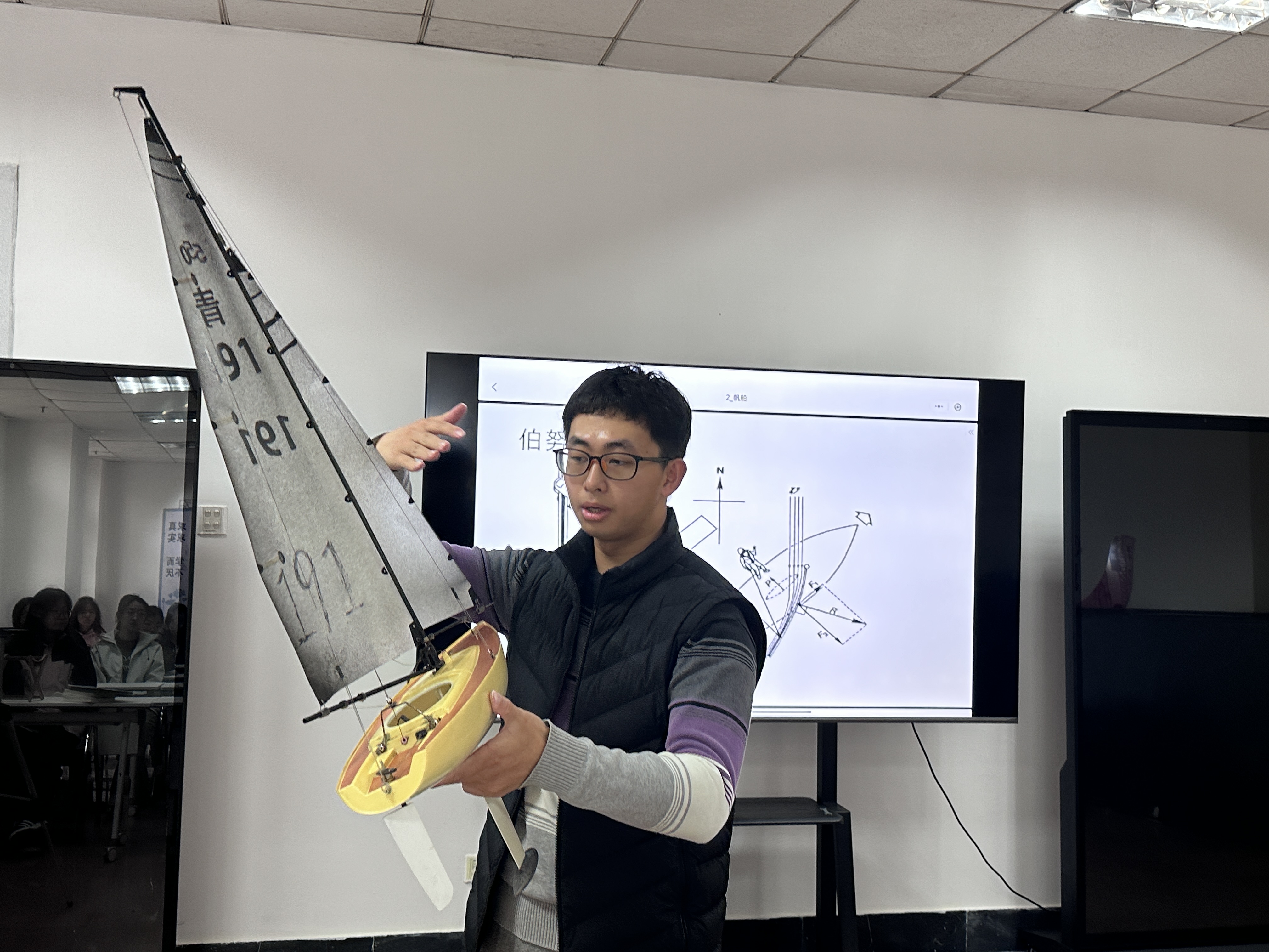 自大学入学以来,陈锦庚从帆船小白一路成长,从加入帆船俱乐部参加专业培训,到加入帆船队代表学校参加各类比赛,并作为校帆船队的一员在2023年中国大学生帆船联赛总决赛夺冠。从懵懂到专业,陈锦庚从自身经历出发,将帆船运动的历史发展、航行原理、竞赛规则等内容娓娓道来,为同学们揭开了帆船世界的神秘面纱。他说到,帆船运动不仅是一项体育竞技活动,更是一种人与自然和谐共处的生活方式。通过控制风帆,利用自然风力前行,增强了个人的航海技能,锻炼了个人意志力和团队合作精神。帆船运动展现了人类面对自然时顽强抗争、永不服输的精神,对于当代青年学生的身体素质教育和精神磨炼起到了非常重要的作用。