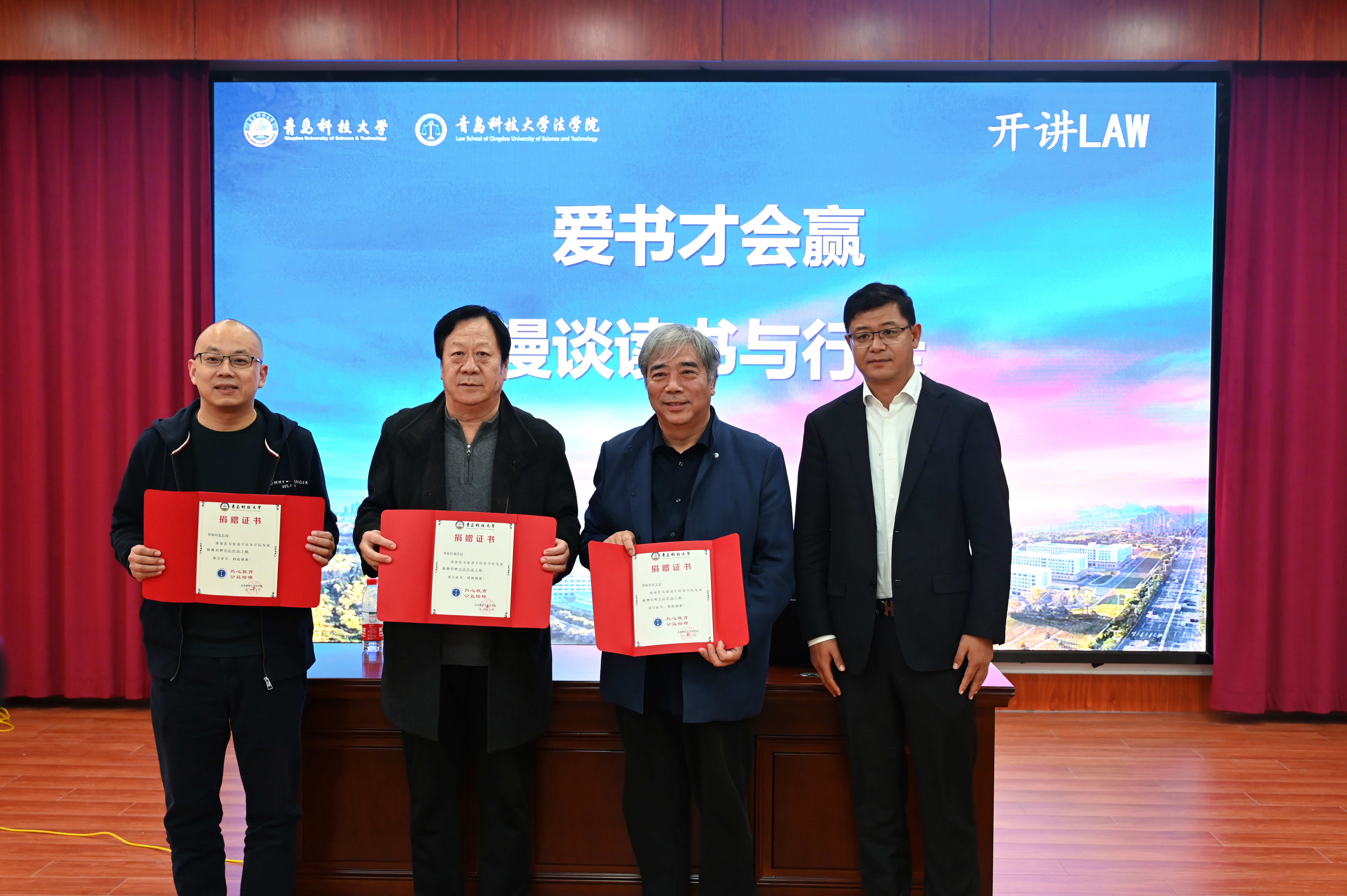 宋文京、张长伟、刘升语三位书法大家分别为法学院团委捐赠了10幅书法作品,曲明为他们颁发了捐赠证书。曲明表示,同学们要向名师大家们学习,读好书、好读书,从书本中学习知识,增长才干,更要多行走,走出宿舍,走出学校,多参加社会实践,锻炼自我,努力成为德智体美劳全面发展的时代新人。