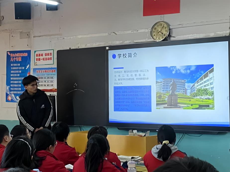 此次活动吸引了山东省莱州一中、潍坊中学、乐陵一中、内蒙古巴彦淖尔市临河区第一中学等六所中学的200余名高三学生集中参会学习。实践团队成员通过形式多样,内容丰富的宣讲活动向学弟学妹们展示着各自高校的校园风貌、学科特色、师资力量以及丰富多彩的校园生活,并结合自身的专业学习,深入浅出地讲解专业课程设置、未来就业方向和发展前景,以此来帮助同学们更好地规划和选择未来的发展道路。团队成员孙溶璐介绍道:“宣讲时回到母校,既是对青春成长的回望,也是对学弟学妹的帮助。”