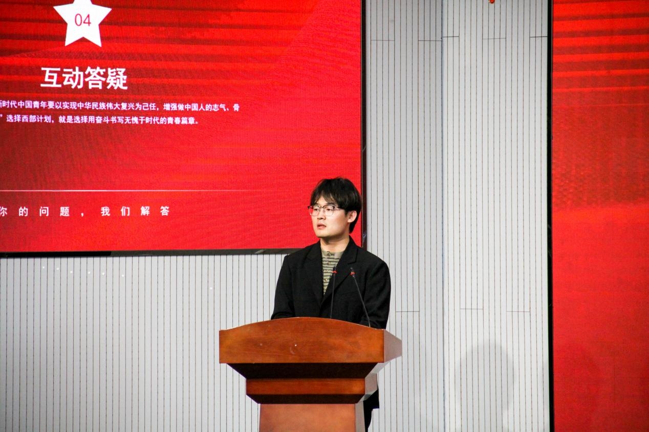 会上,杨小明鼓励2025届毕业生积极投身西部建设,为国家的发展贡献青春力量。他强调,西部计划不仅是一次志愿服务的机会, 更是一次难得的成长与历练,希望同学们能够抓住机遇,勇敢追梦。校团委副书记李浩为刘猛颁发荣誉证书。现场学生踊跃提问,一一解答学生问题。