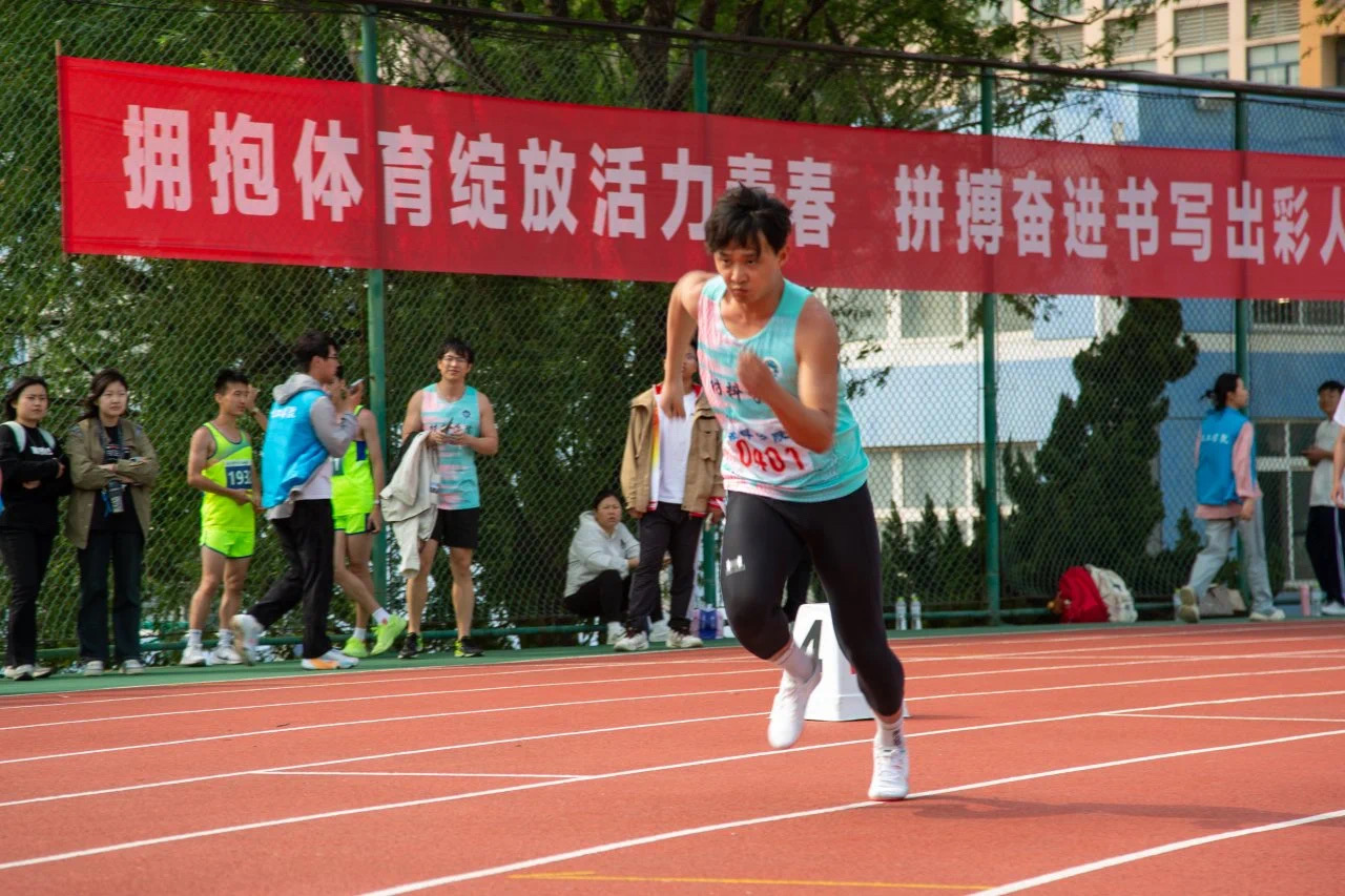 赛场上,材料健儿们火力全开。在1500米长跑赛道上,他们如坚毅的“碳纤维”,凭借超强耐力突破自我;跳高场地前,腾空跃起的身影似柔韧的“纳米材料”,一次次刷新高度;4×400米接力赛中,交接棒的瞬间如同精密的“材料合成工艺”,将速度与默契完美衔接。看台上,由学院学生组成的观众手持印有“材华横溢,料勇争先,乘风破浪,斗志昂扬”字样的加油板,加油声浪此起彼伏;志愿者团队全程待命,为运动员提供最坚实的后盾。
