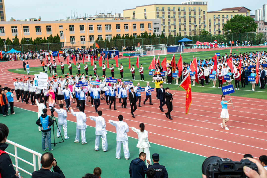 入场式上,学院师生代表队方阵精神抖擞、意气风发。他们迈着整齐划一的步伐,喊着高昂嘹亮的口号。方阵中,激昂的敲鼓表演,鼓槌起落间,激昂的鼓点声声震耳,将现场气氛瞬间点燃。学院中德教师组成的前排方阵,成为了一道亮丽的风景线,他们手中挥舞着“Ich liebe Tsingtao(我爱青岛)”“Ich liebe CDTF(我爱中德)”的手持牌,表达着对青岛、对学院的热爱。学院巧妙融入的烟台海阳螳螂拳与胶州非遗秧歌元素成为一大亮点,螳螂拳刚柔并济、灵动迅猛,胶州秧歌婀娜多姿、韵味十足,充分彰显出学院在传承与弘扬中华优秀传统文化方面的独特魅力,更凸显出学院开放包容、多元融合的办学风格。