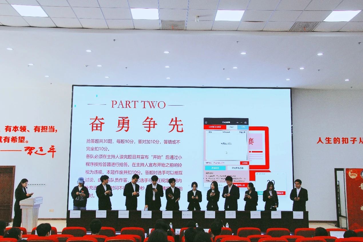 在决赛的“单枪匹马——必答题”、“奋勇争先——抢答题”和“知难而退——风险题”三大环节中,参赛队员王宇翔、孙鹏铠、王晓莉凭借扎实的团史知识基础、灵活的应变能力,充分展现了中德学子深厚的专业素养与出色的应变能力。