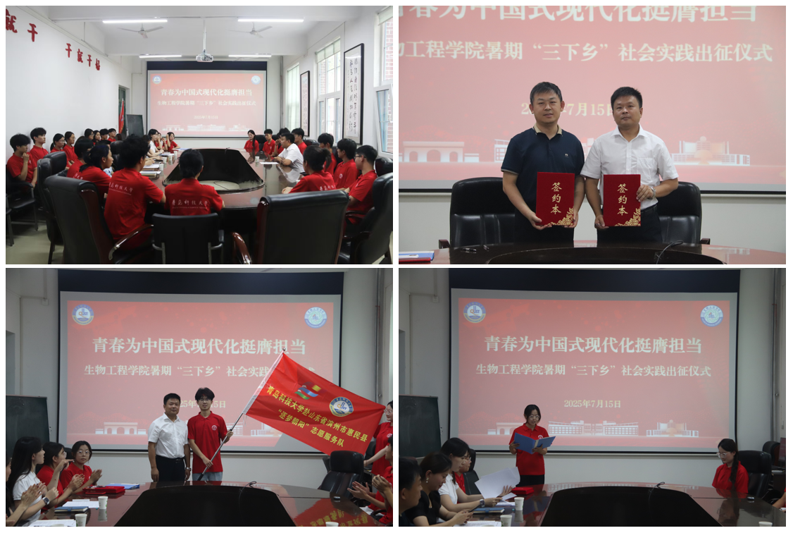 为深化实践育人和“大思政课”工作成效,引导鼓励青年学生把课堂学习和社会实践紧密结合,7月15日下午,生物工程学院在学院会议室举行2025年暑期“三下乡”社会实践出征仪式,仪式由生物工程学院团委副书记刘金岭主持。
