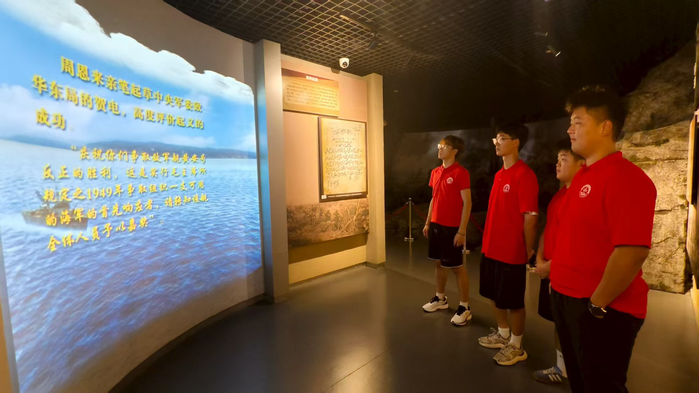 随后,实践团移步观影墙区域,在周恩来亲笔起草的嘉奖电手稿前久久驻足。1949年黄安舰起义成功的电文中,“请转知全体人员予以嘉奖”一句笔力遒劲、墨迹透纸,背后承载着一段关于廉洁的佳话——起义官兵不仅以英勇行动推动历史进程,更以“军舰完好无损,账册分文不差”的高度自律,将国家财产完整交还人民。讲解员动情地说:“这封电报嘉奖的不仅是军事胜利,更是共产党人对‘公私分明、克己奉公’的坚守,是廉洁精神在关键时刻的生动彰显。”成员们凝视着手稿上力透纸背的字迹,仿佛触摸到了先辈们“心有戒尺、行有规矩”的精神温度。