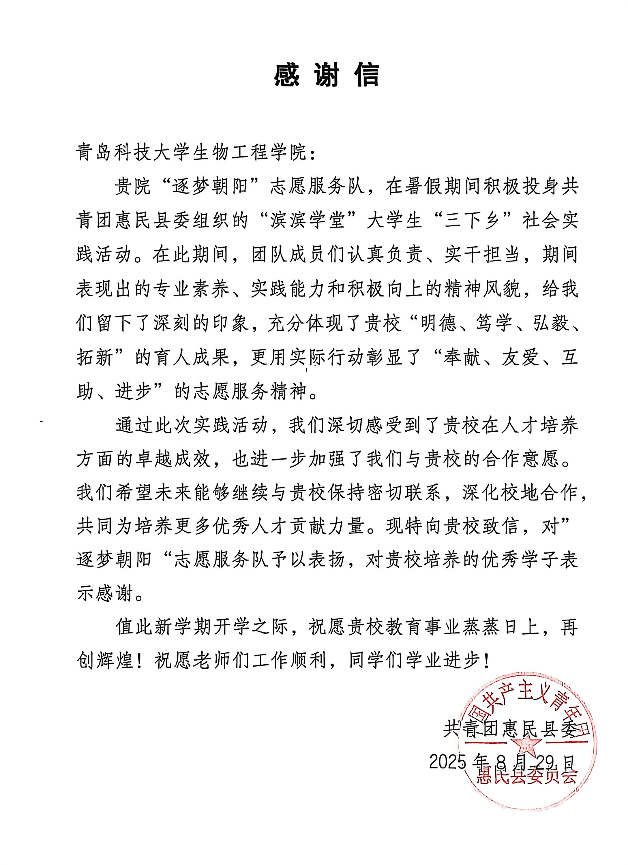 近日,生物工程学院“逐梦朝阳”志愿服务队收到了共青团惠民县委员会发来的感谢信。信中,团委对参与志愿服务的青年学子们给予了高度肯定和表扬,称赞他们不仅展现了当代青年大学生的责任感和使命感,更以实际行动为学院和社会树立了榜样。这些青年在志愿服务过程中,不畏艰难,勇于担当,用青春的热情和智慧,为惠民县的教育事业贡献了宝贵的力量,赢得了广泛的社会赞誉。