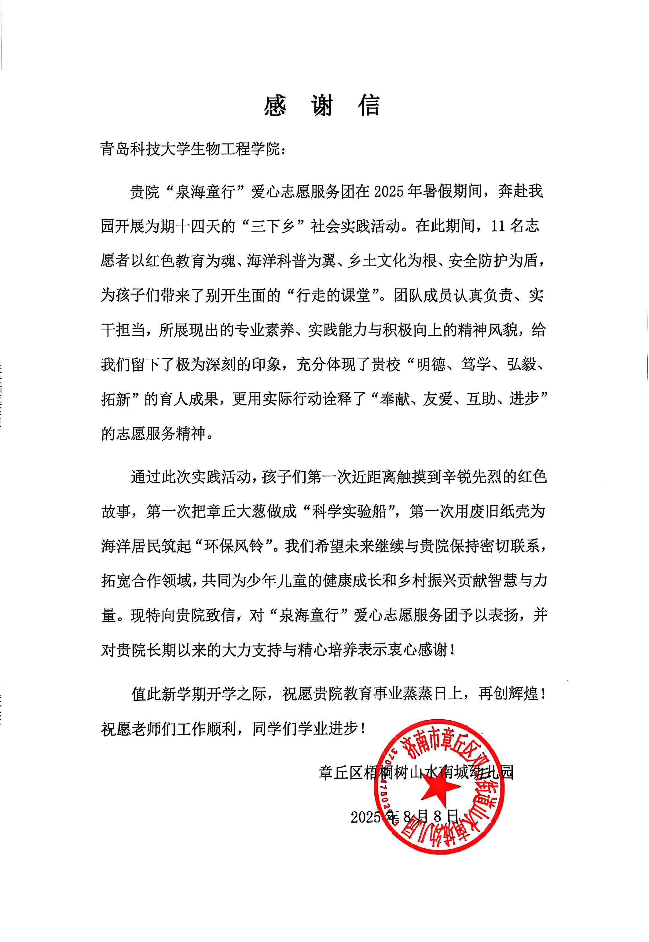 近日,生物工程学院“泉海童行”爱心志愿服务团收到了济南市章丘区山水南城幼儿园寄来的感谢信。信中,幼儿园对参与暑期“三下乡”社会实践的11名同学给予高度肯定,称赞他们“以红色教育为魂、海洋科普为翼、乡土文化为根、安全防护为盾,为乡村儿童打造了一间行走的课堂”,充分彰显了青科大学子的责任担当与青春风采。
