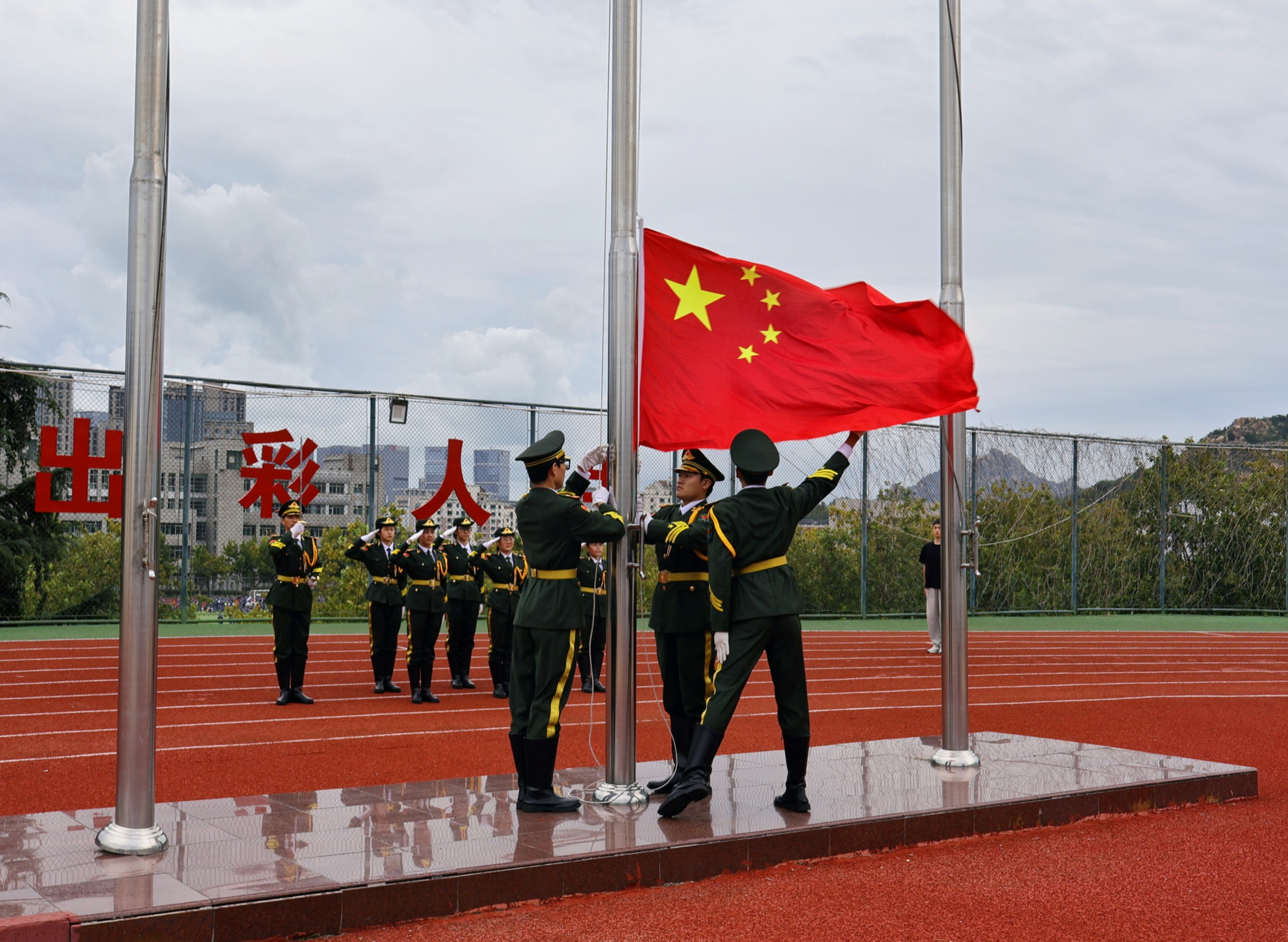 迎着清晨的微风,鲜艳的五星红旗在雄壮的国歌声中升起,全体师生庄严肃立、齐唱国歌,向国旗行注目礼。