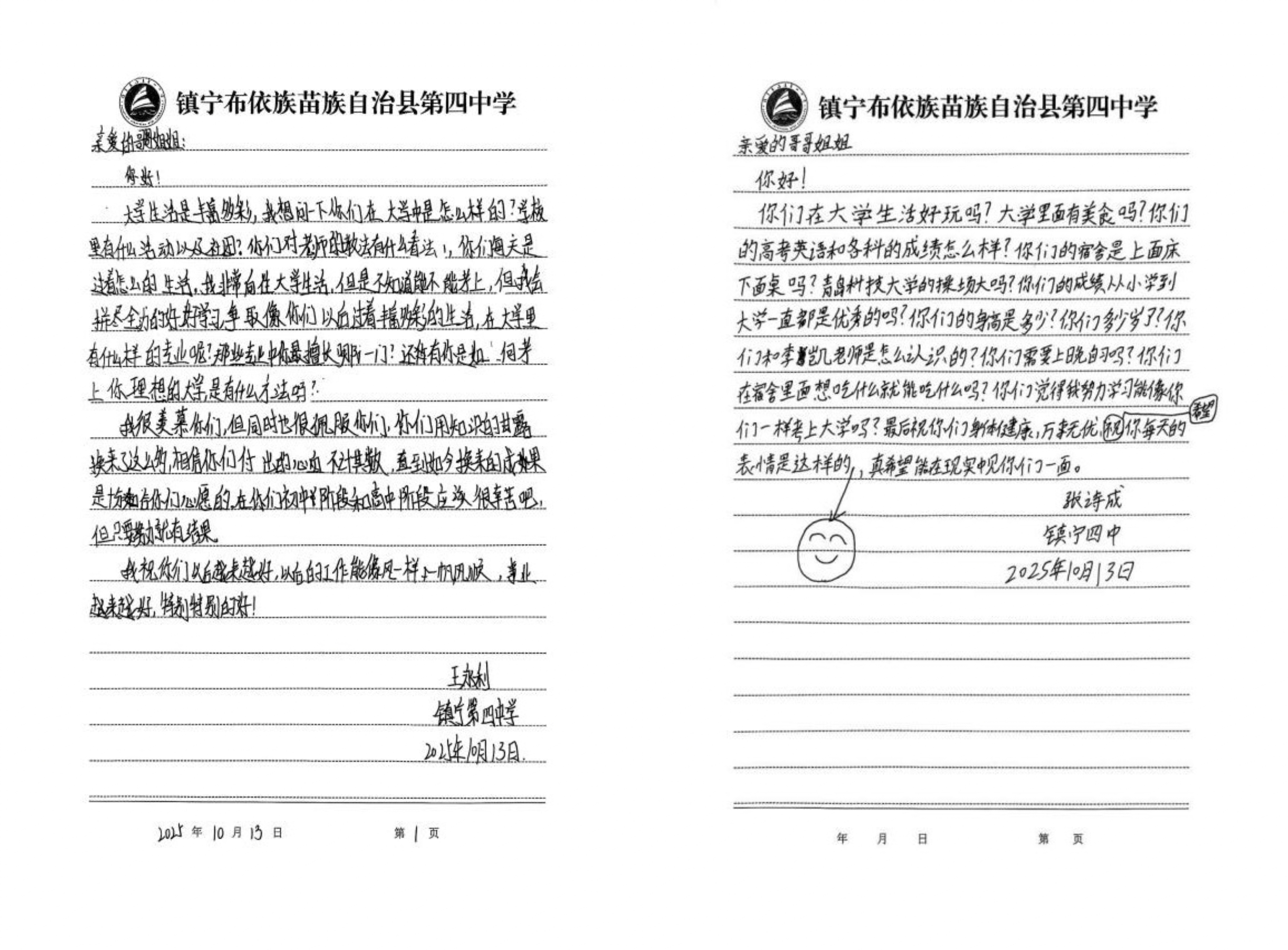 不久前,贵州省镇宁布依族苗族自治县第四中学的孩子们在信息学院研究生研支团成员李凯的引导下,给远方的“大学哥哥姐姐”写下了一封封信。“姐姐,青岛的海是什么颜色的?”“大学里面有美食吗?宿舍是上面床下面桌吗?”信纸上写满了他们对大学生活的无限好奇,以及对未来的美好憧憬。