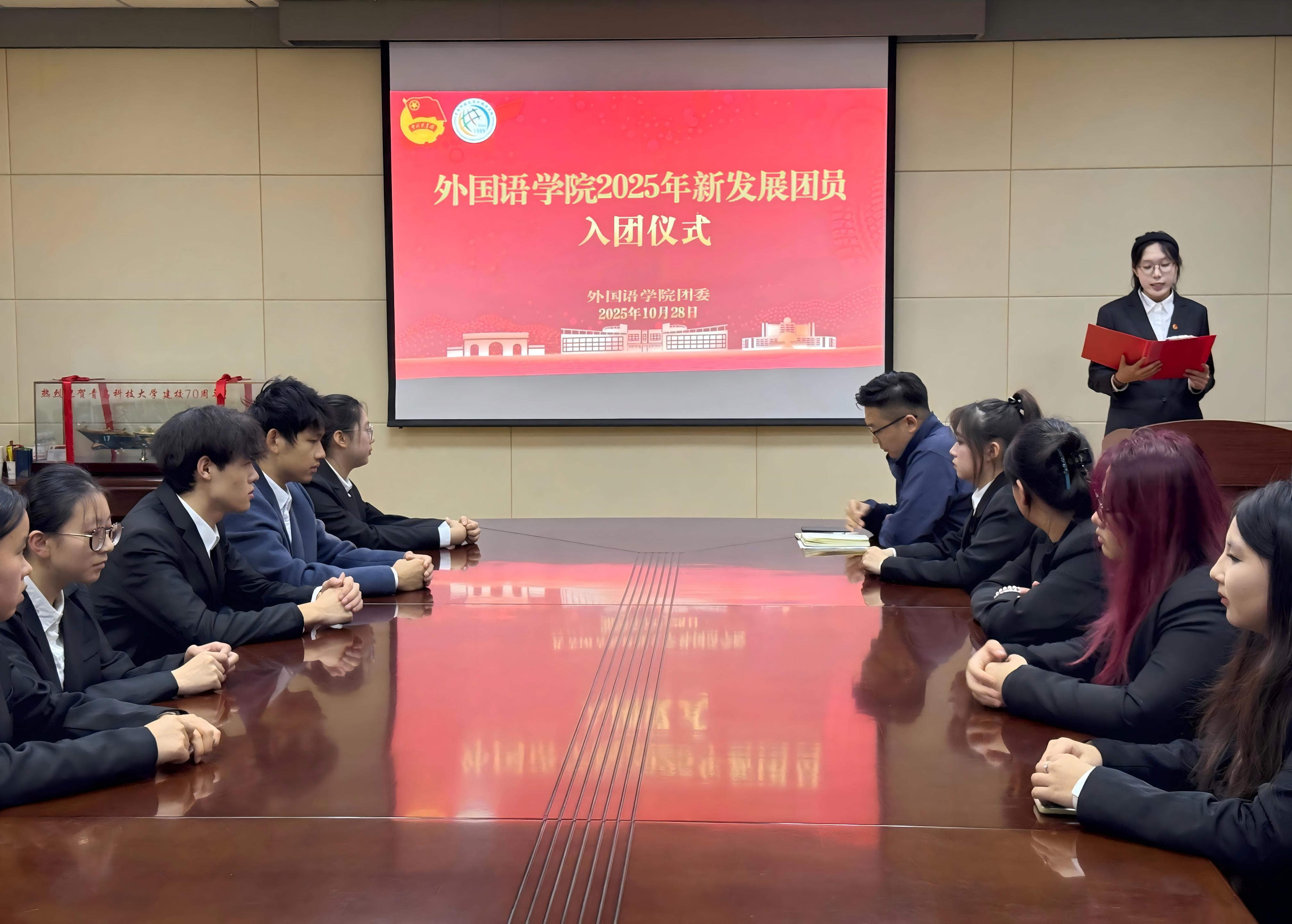 为进一步强化青年思想引领,进一步激发新团员的责任担当与时代使命感,10月28日,外国语学院团委举行2025年秋季新发展团员入团仪式。会议由外国语学院团委副书记王玉凯主持。