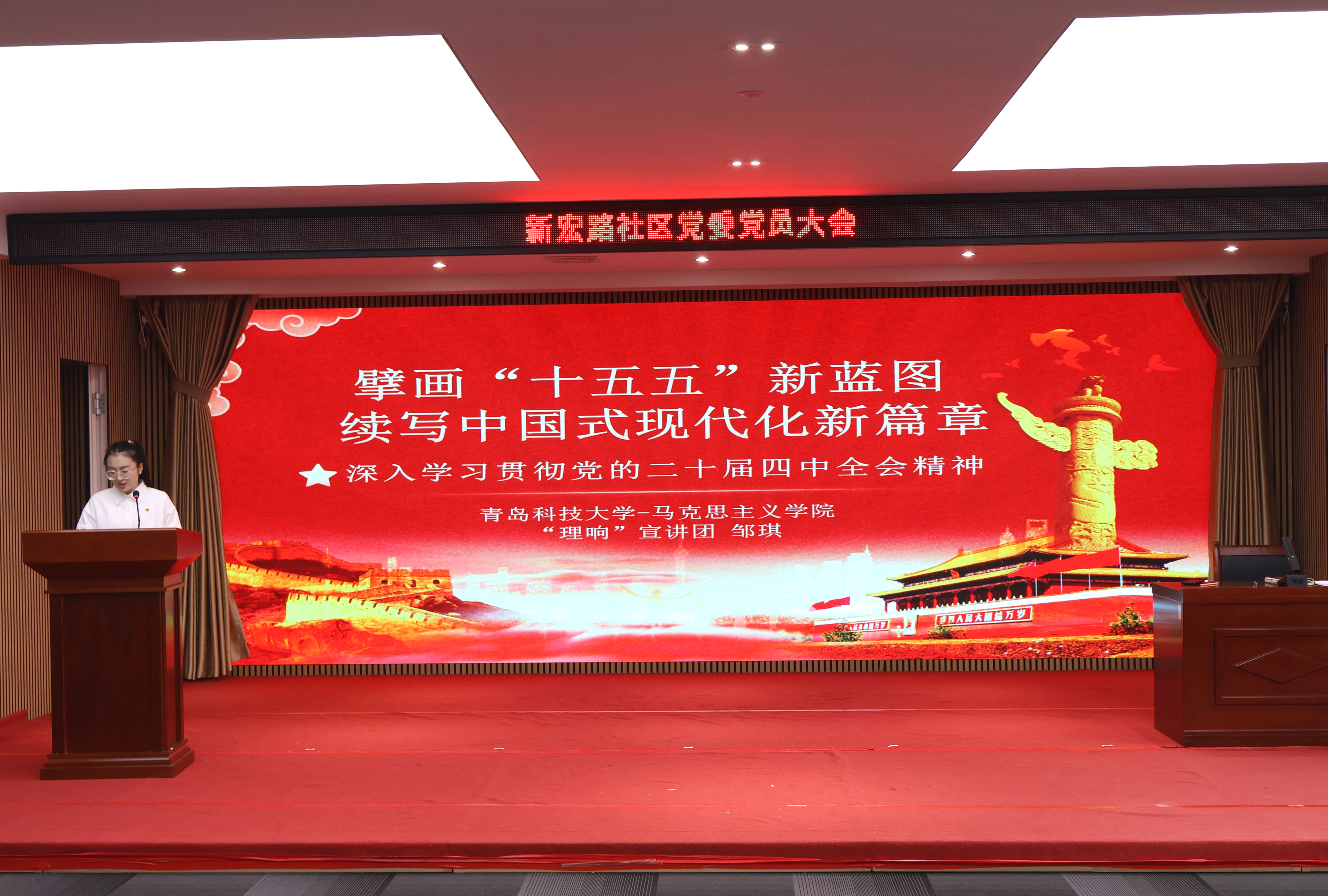 邹琪以《擘画“十五五”新蓝图 续写中国式现代化新篇章》为题,系统解读了党的二十届四中全会精神与“十五五”规划蓝图。她从“五年规划”的由来与意义出发,回顾了“十四五”时期我国取得的显著成就,明确了“十五五”承前启后的关键定位,号召全社会凝心聚力,将宏伟蓝图转化为可感可知的民生实效。陈艺然以《聚焦国家治理现代化共建幸福美好新家园》为题,结合社区“多网合一”治理、“一站式”服务等生动实例,阐释了国家治理现代化的深刻内涵。她强调要筑牢党的领导、人民当家作主、民主法治等制度根基,呼吁居民以关心、参与、担当和信任,共同建设幸福美好的家园。