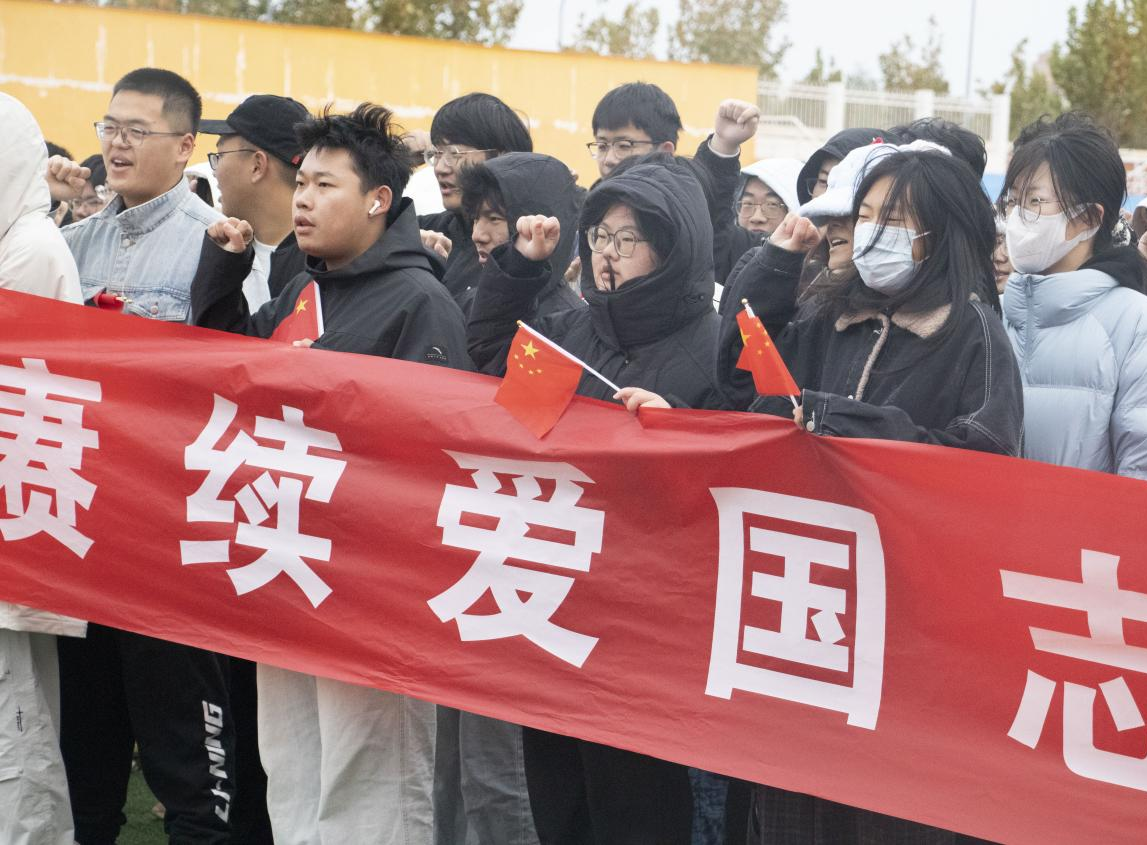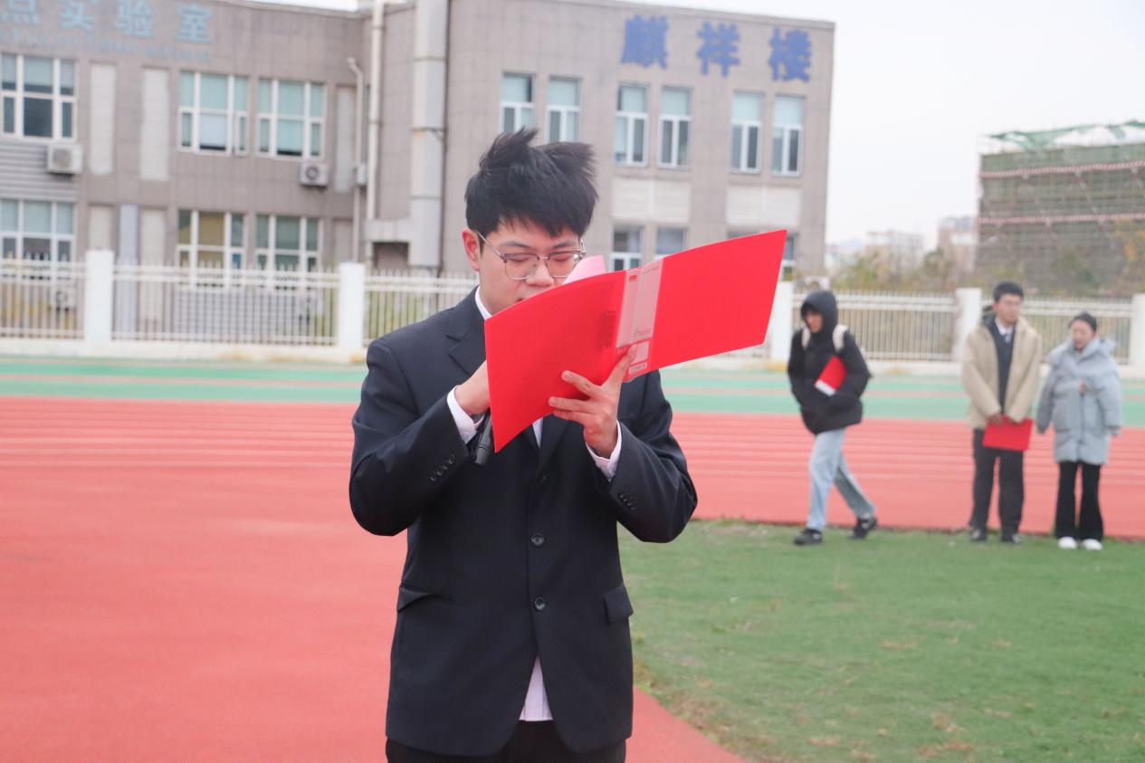 最后,2025级学生代表姜兆琛带领全体同学庄严宣誓。同学们举起右拳,声音洪亮而坚定,一句句誓言铿锵有力,回荡在操场的上空,表达了同学们赓续爱国志、奋进新时代的决心与信心。