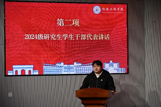 在主题团课上,逄柏鹏为2025级研究生团学干部代表颁发聘书,并代表学院团委向全体研究生团学干部表示祝贺,结合学校学院实际,围绕团学工作使命,提出四点希望:一是筑牢思想根基,提升引领力,以理想信念为舵,做传递价值导向、凝聚青春力量的“机电排头兵”;二是强化协作意识,锤炼组织力,主动担当作为,成为推动学院各级团组织建设提质增效的“关键抓手”;三是坚守服务初心,增强服务力,牢记“全心全意为同学服务”的宗旨,脚踏实地为同学办实事、解难题;四是立足长远发展,提升贡献度,在科研创新、学科竞赛、志愿服务等领域勇当先锋,以实际行动彰显新时代研究生的青春底色与责任担当。