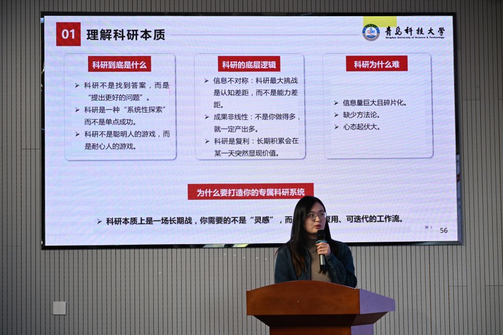 田雨以“科研是场马拉松——打造你的个人科研操作系统”为题,结合自身科研经历,分享了如何构建个人科研体系。她提出通过高效输入、任务管理与论文写作系统化提升科研效率,并结合SCI发表经验,强调以长期视角看待失败与成长,助力科研者稳健前行。她鼓励同学们尽早建立科研习惯,实现从“被动学习”到“主动探索”的转变。