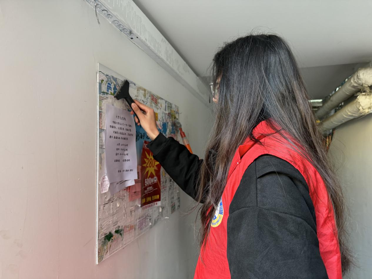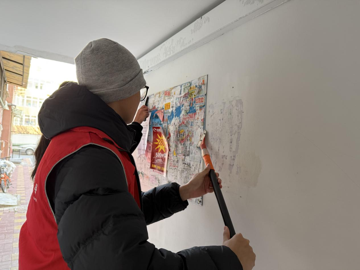 活动现场,红马甲们手持工具,细心铲除小广告,用消毒液和钢丝球擦亮城市角落。短短一小时,200余张非法小广告被清除,4袋垃圾被回收,社区环境焕然一新。居民们赞不绝口,一位老奶奶更是为志愿者们点赞,社区因青春力量而美丽。