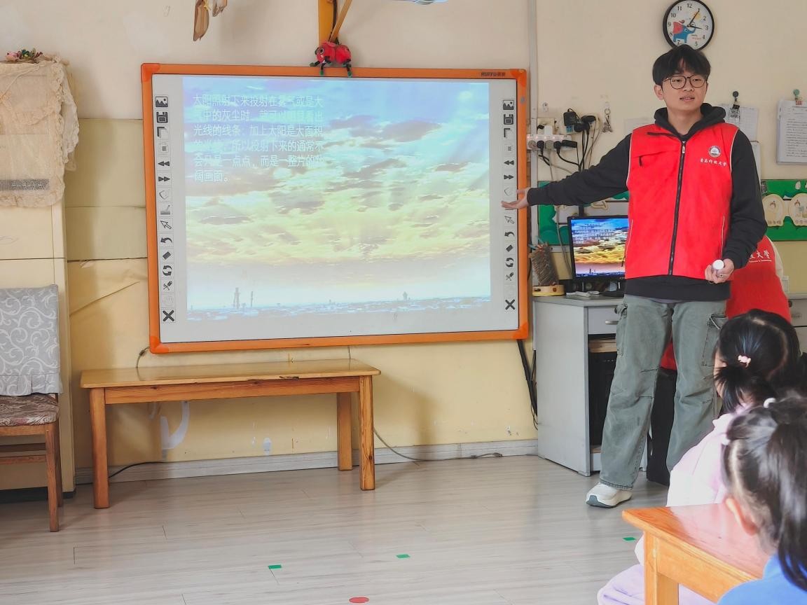 活动现场,志愿者们化身小老师,用耐心与温柔陪伴孩子们探索光的秘密,暖场导入时,志愿者先以“能不能看见光”的趣味提问唤醒好奇心,消除孩子们对陌生实验的隔阂感,实验演示环节,志愿者精准操作手电筒与棱镜,避免强光照射孩子眼睛,让孩子们了解实验的过程,用激光笔照射配好的胶体和喷雾瓶模拟水雾,让孩子们看到清楚的光路。演示完毕后,其他志愿者则分组和孩子们一起动手实验,轻声鼓励内向的孩子大胆观察。孩子们纯真的笑脸与主动分享的热情,也让志愿者们深切体会到童真回馈的温暖。