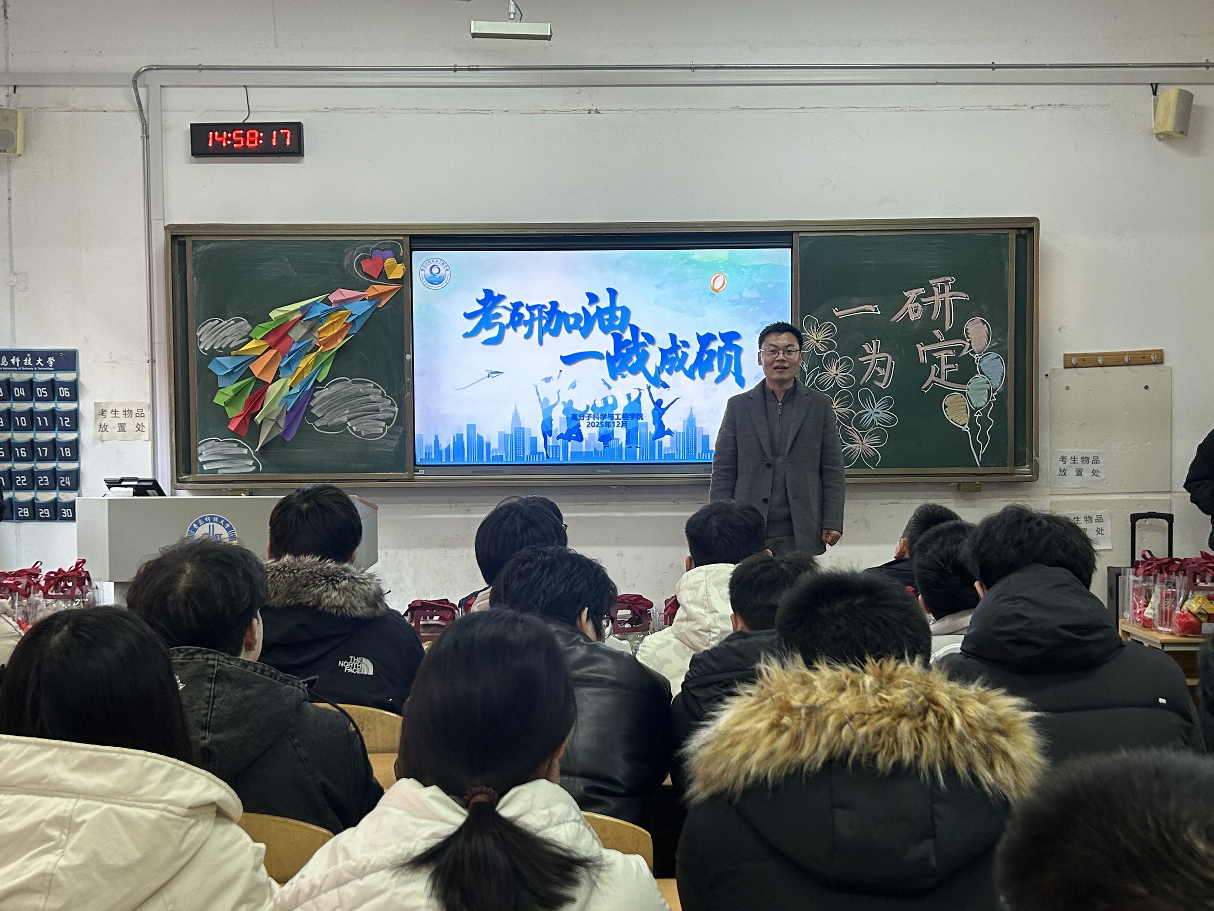 为鼓舞考研学子斗志,传递学院温暖关怀,12月15日,高分子学院在二教118举办2026届考研加油助力活动。学院党委书记宣宗伟、院长张建明、2022级班主任代表及辅导员老师代表参加本次活动。活动现场,宣宗伟代表学院,向孜孜不倦、全力拼搏的学子们表达了深切关怀与殷切期望。他高度肯定了大家长期以来的辛勤付出与执着坚守,并寄语同学们在最后阶段稳住心态,专注当下。他表示,学院始终是同学们的坚强后盾,将不遗余力为大家的梦想保驾护航。随后,张建明结合自身经历与当前考研形势,为同学们送上真挚鼓励。他指出,冲刺阶段不仅是知识体系的巩固期,更是心态调整的关键期,希望同学们坚定信心、沉着备战,以饱满的精神和从容的姿态迎接挑战,同时注意劳逸结合,保持规律作息与积极心态。