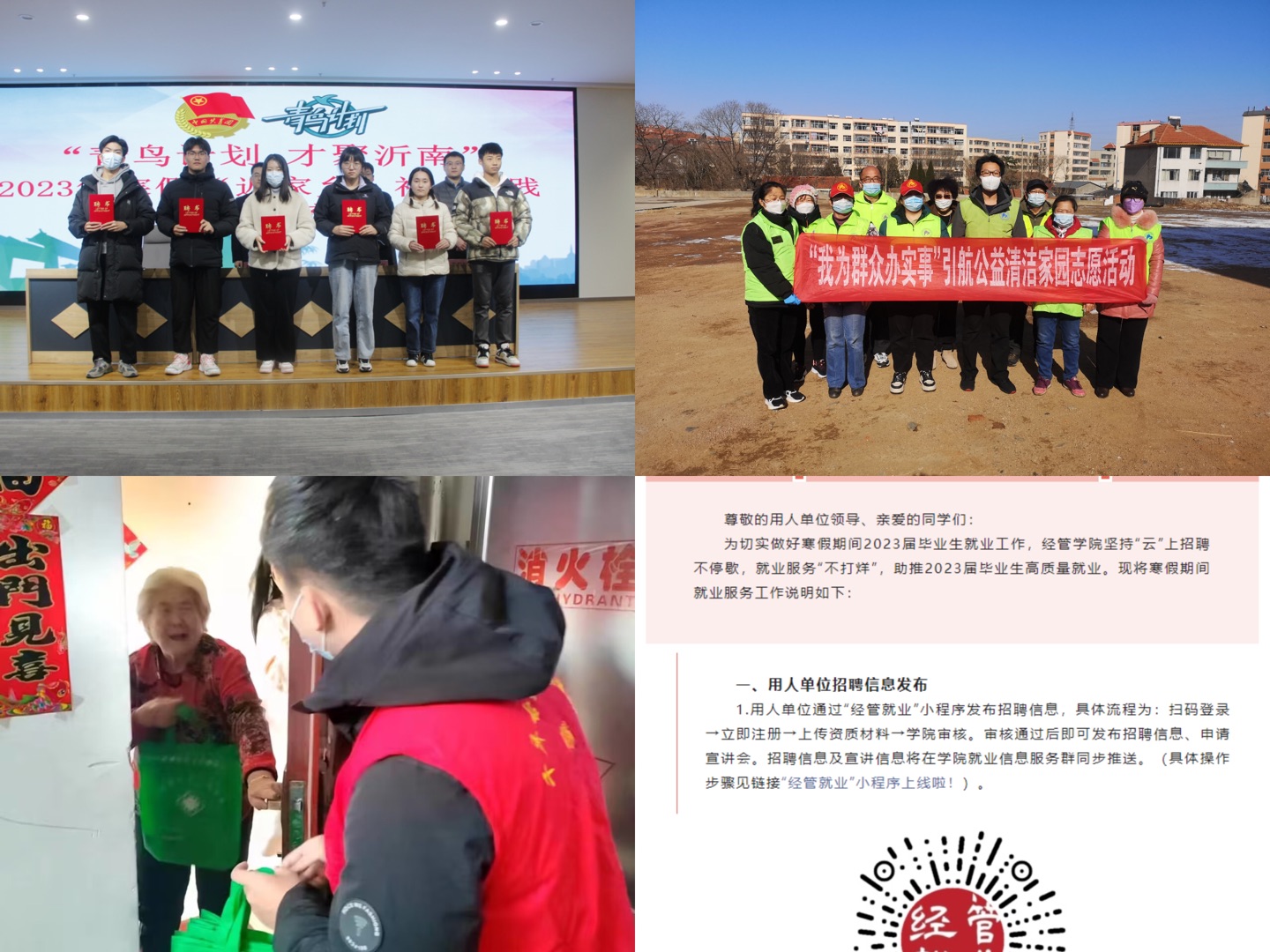 经管学院团委坚持“云”上招聘不停歇,就业服务“不打烊”,通过“青鸟计划”小程序汇总企业信息和招聘岗位,发布《寒假就业服务指南》,畅通就业信息渠道,为解决毕业生就业保驾护航。自动化学院团委召开专题会议,持续推进“我为青年办实事”活动,寒假期间持续进行低收入家庭毕业生结对帮扶,聚焦学生实际需求、精准推送岗位,帮助学生顺利找到工作。体育学院团委组织学生积极报名“青鸟计划”投身到社区、乡镇和县级机关进行体悟锻炼引导学生从实践中深入了解民情和社会发展情况,为未来就业奠定坚实基础。信息学院团委举行就业经验分享会,指导学院学生学习简历制作、掌握面试技巧、提高核心竞争力,学生就业提供实实在在的帮助