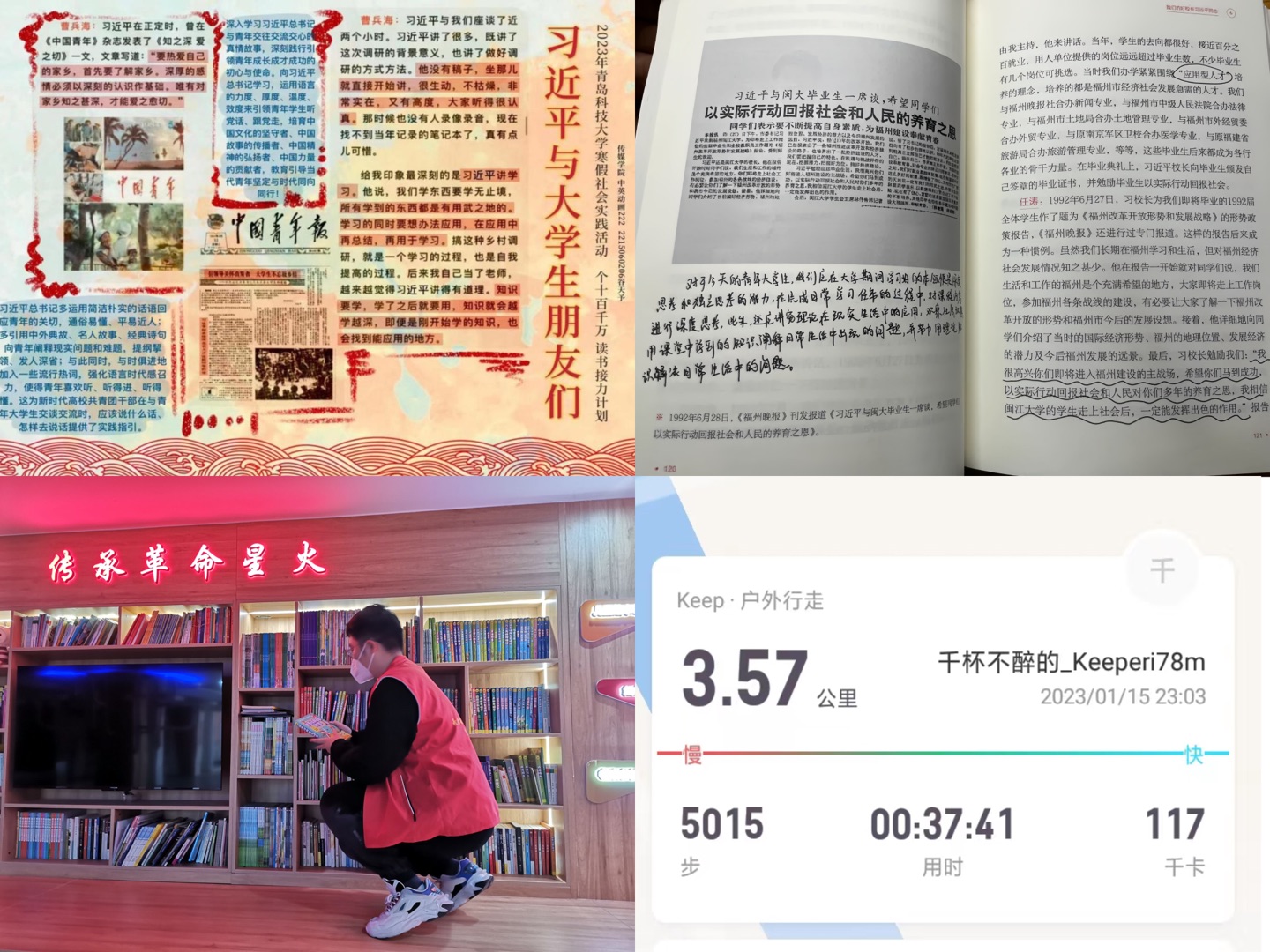 海洋学院团委引导广大青年树立健康向上的生活方式,鼓励学生实现体育锻炼“由校到家”动态串联,每天完成定量运动打卡上传在体育锻炼中享受乐趣、增强体质、健全人格、锤炼意志,进一步打造“爱体育·兴科大”体育品牌。机电学院团委将寒假社会实践与劳动教育课程相结合,在学习通发布分组任务、以个人提交形式落实寒假社会实践的参与度和质量,五育并举促进学生全面发展法学院团委持续开展好“个十百千万”读书工程,推出“重温党史故事,传承百年薪火”主题名著读书接力活动,通过主题团日、团课教学、社会实践等形式开展学习,引导广大青年学生养成“多读书、读好书、好读书”的良好习惯传媒学院团委开展“1+21读书打卡”,积极发挥新媒体媒介优势,采用个人与团队相结合、小组与班级相结合、线上与线下相结合、自我实践与集中研讨相结合、跨年级跨专业接力等多种方式开展读书打卡实践活动