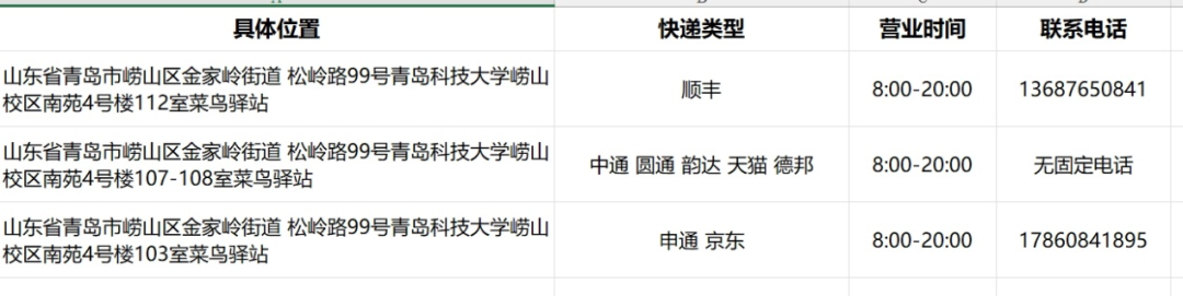 为了让同学们能更便捷地享受到取、拆快递的快乐,校学生会权益部对崂山校区快递站点分布情况进行了调研。调研内容为:快递点的具体位置,接收的快递类型,营业时间及联系电话。这大大提高了同学们取、寄快递的效率,有效缓解了高峰时期的拥堵情况,让大学生活更加有序和谐。