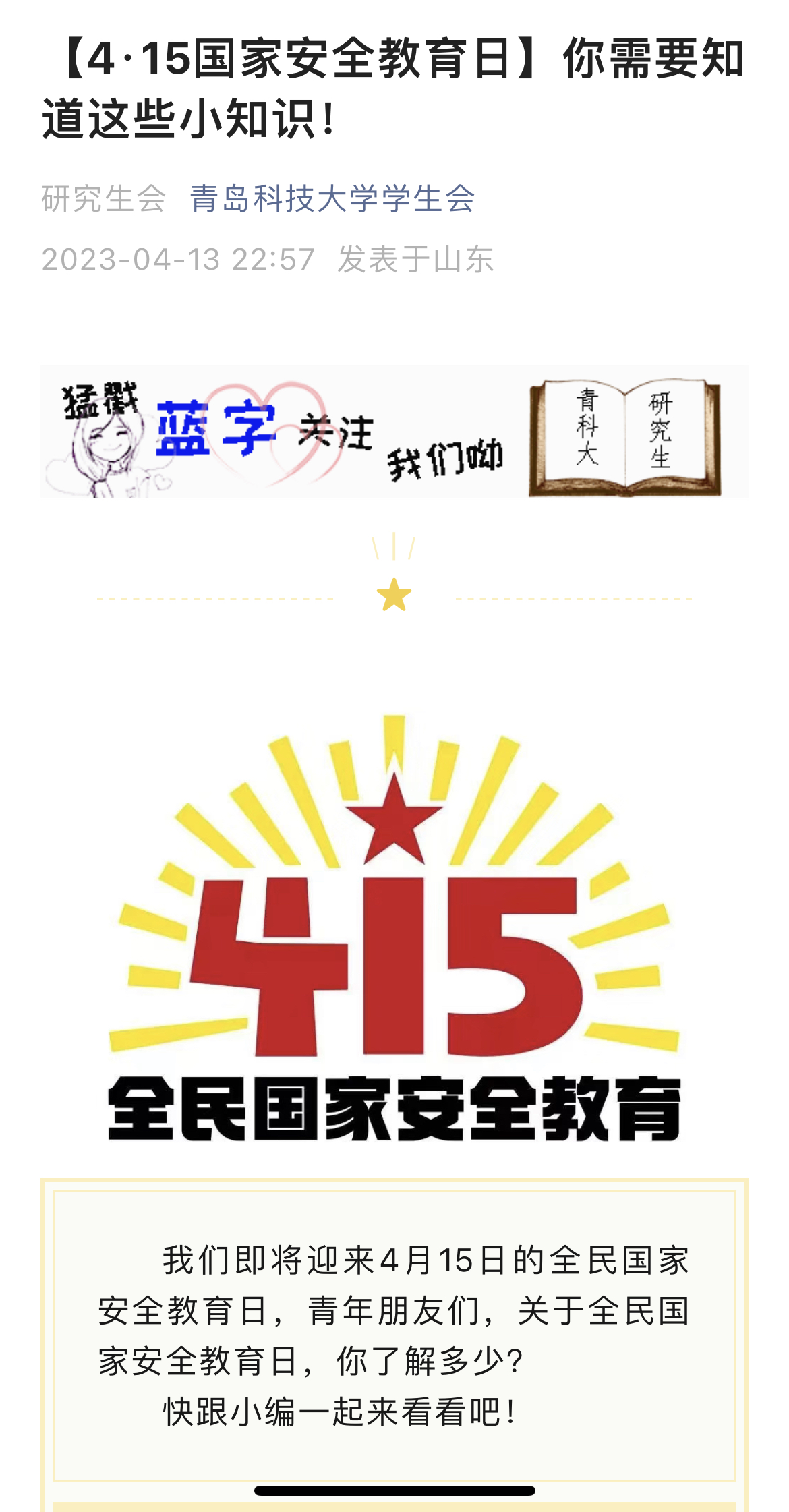 习近平总书记在党的二十大报告中指出:“国家安全是民族复兴的根基,社会稳定是国家强盛的前提。”2023年4月15日是我国第八个全民国家安全教育日。为贯彻落实习近平总书记关于做好国家安全工作的重要指示精神,增强全校师生国家安全意识和法律意识,校研究生会线上、线下多举措组织开展以“贯彻总体国家安全观,增强全民国家安全意识和素养,夯实以新安全格局保障新发展格局的社会基础”为主题的系列教育活动。