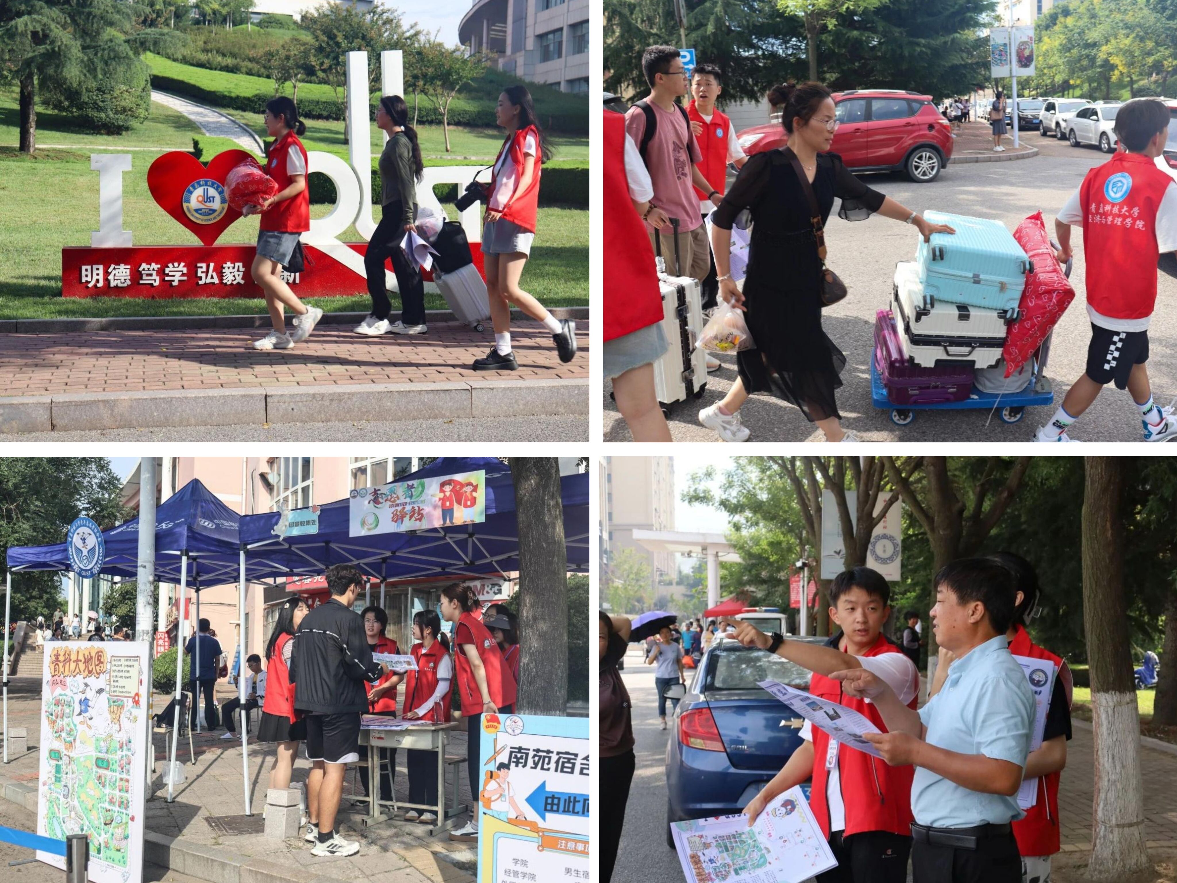 艳阳高照下,“青科志愿红”在咨询引导点、行李暂存点、学院报到点为新生入学保驾护航。